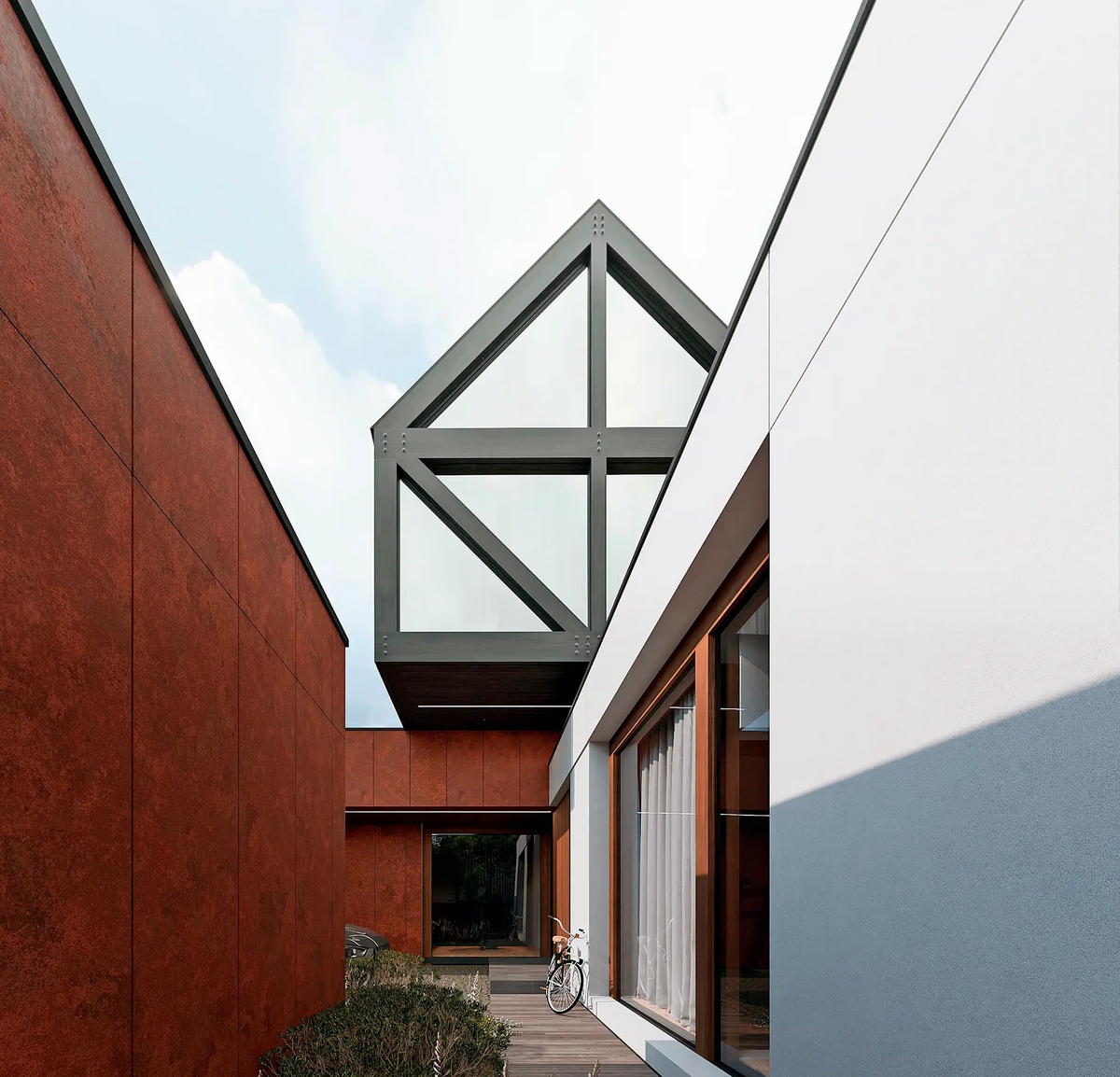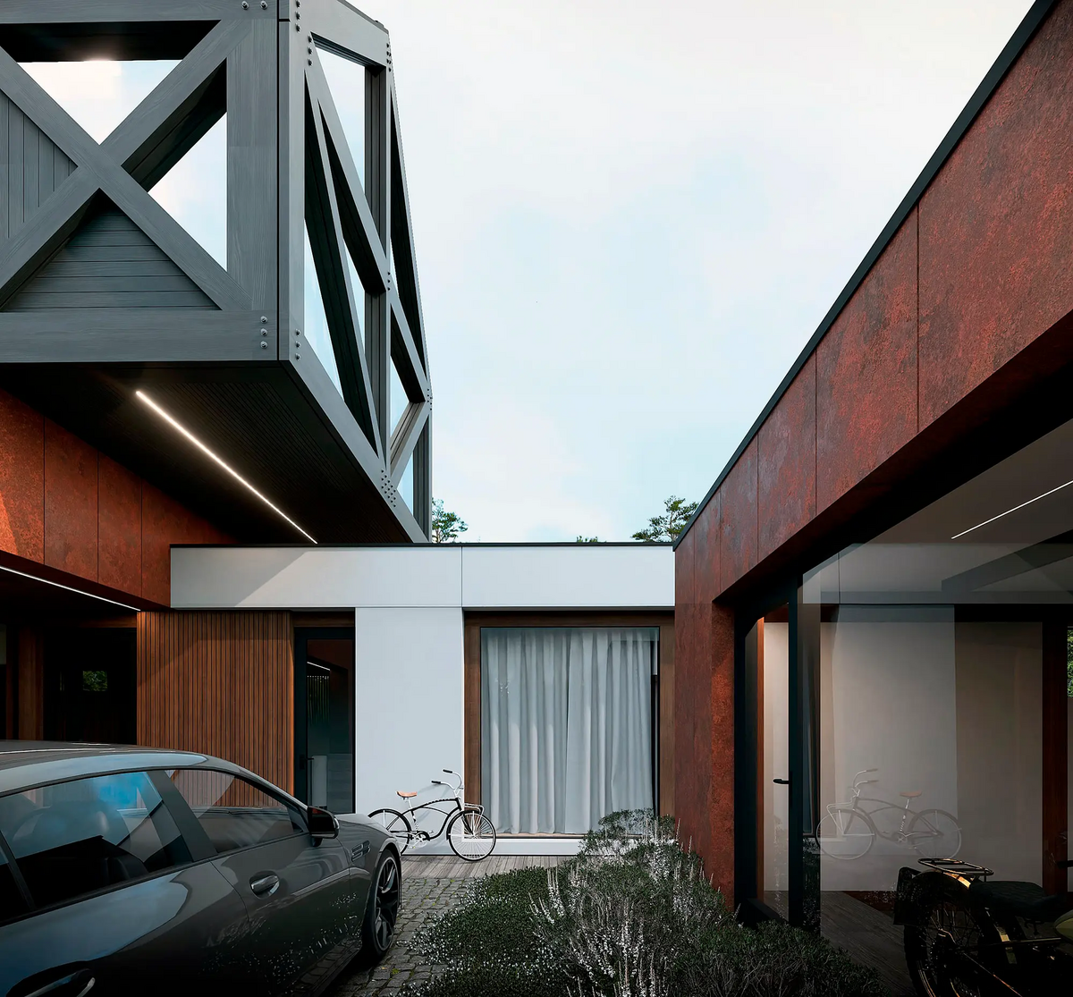 Основообразующей задачей для этого дома была в том, чтобы создать для его хозяев не просто дом, а целую замкнутую систему, где есть место как для повседневной жизни, но и для образования, хобби, развлечения и искусства. В доме располагается четыре спальни, три из которых - детские, плюс мастер-блок. Все спальни имеют вид на основной двор и имеют выходы на террасы. Эти два спальных крыла разделяет просторная зона гостиной и кухни-столовой.